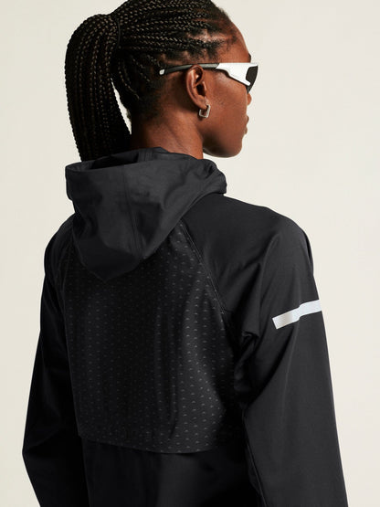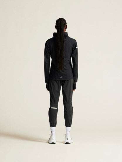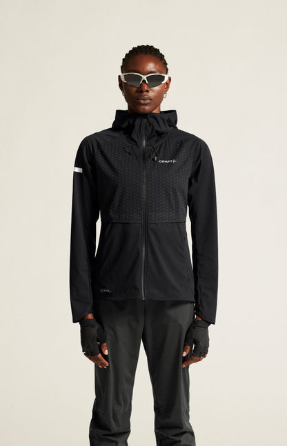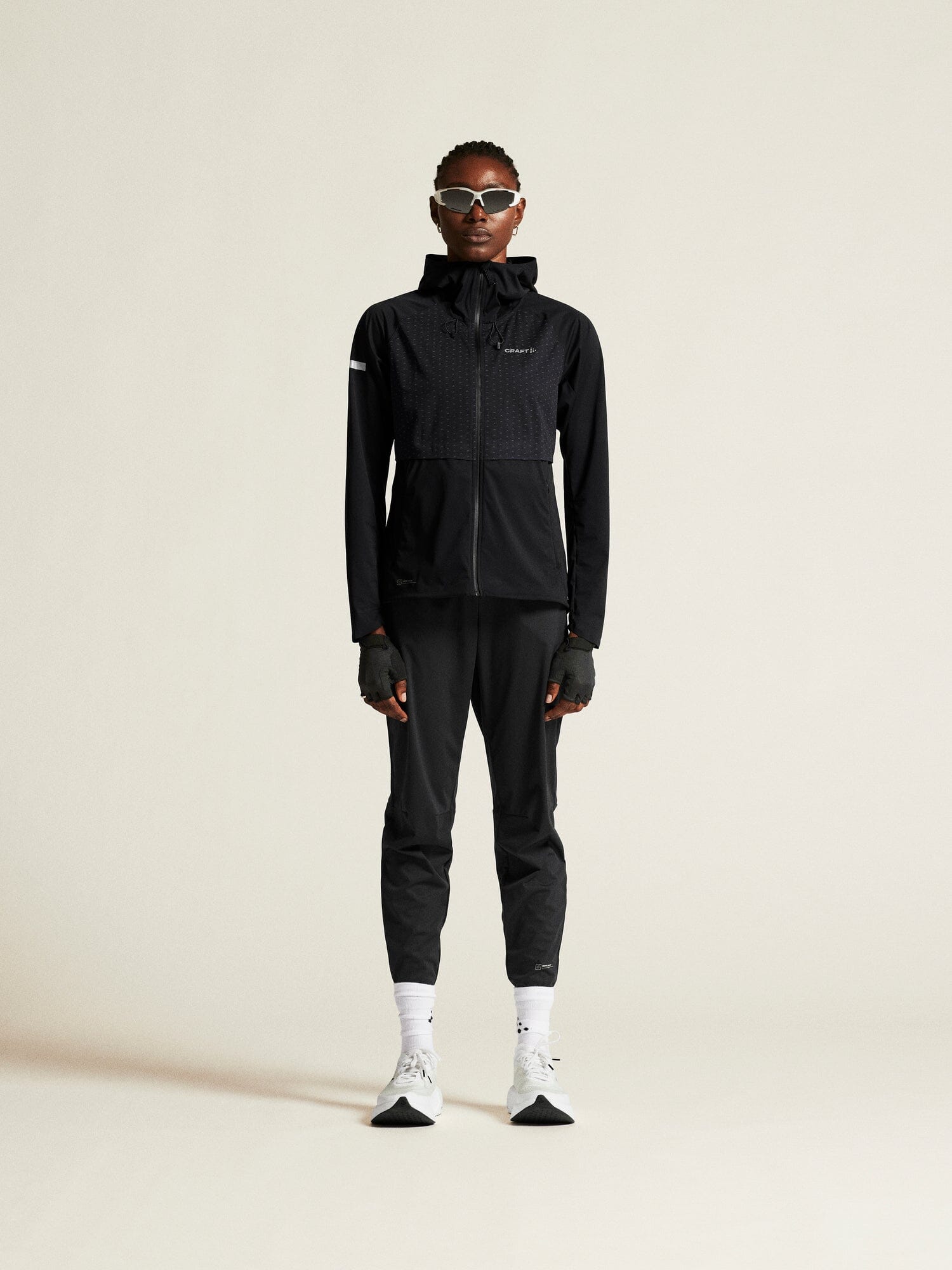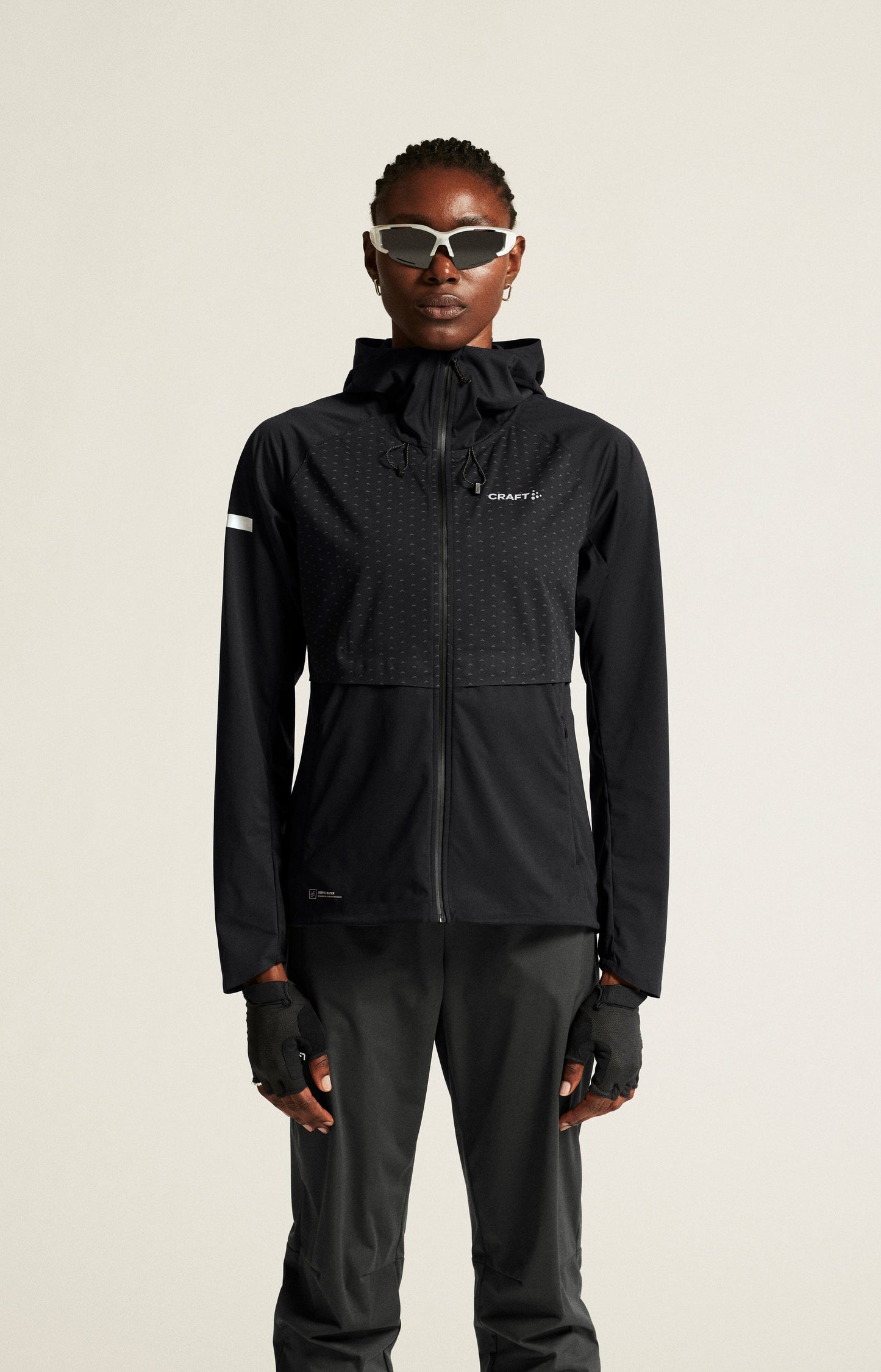 The Craft Sportswear Women's Pro Hydro Lumen Jacket 3 offers protection and comfort for runners. This pro-grade running jacket features Ventair waterproof and breathable 3-layer fabric. With its unique 360° reflective details, you're ensured safety in low light conditions. Ventilation is conveniently positioned at front and back yokes, while an adjustable hood can be safely secured with a strap at the back when not in use. Store small essentials in two hidden side zip pockets. Experience a cool run, every time.