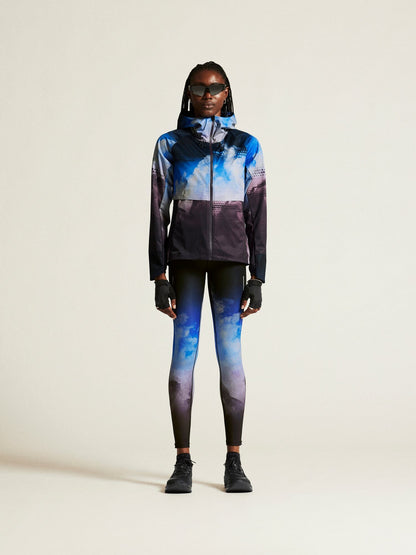 Introducing the Craft Sportswear Women's Pro Hydro Jacket 3. This premium running jacket features a 3-layer Ventair fabric for windproof and waterproof protection. With a high WP 15k/MVP 10k rating, you can confidently face the elements. An adjustable hood, reflective details and an elastic loop fastening at the neck ensure both comfort and safety. For storage, there are two concealed front pockets with zips. The jacket also features adjustable elastic draw cords at the bottom hem, elastic inner sleeve endings, and a mesh lining at the yoke for breathability.