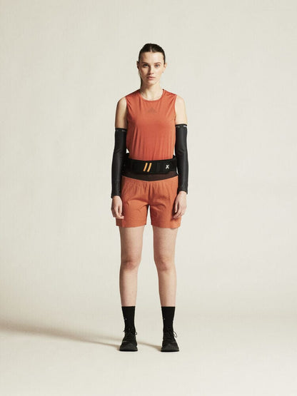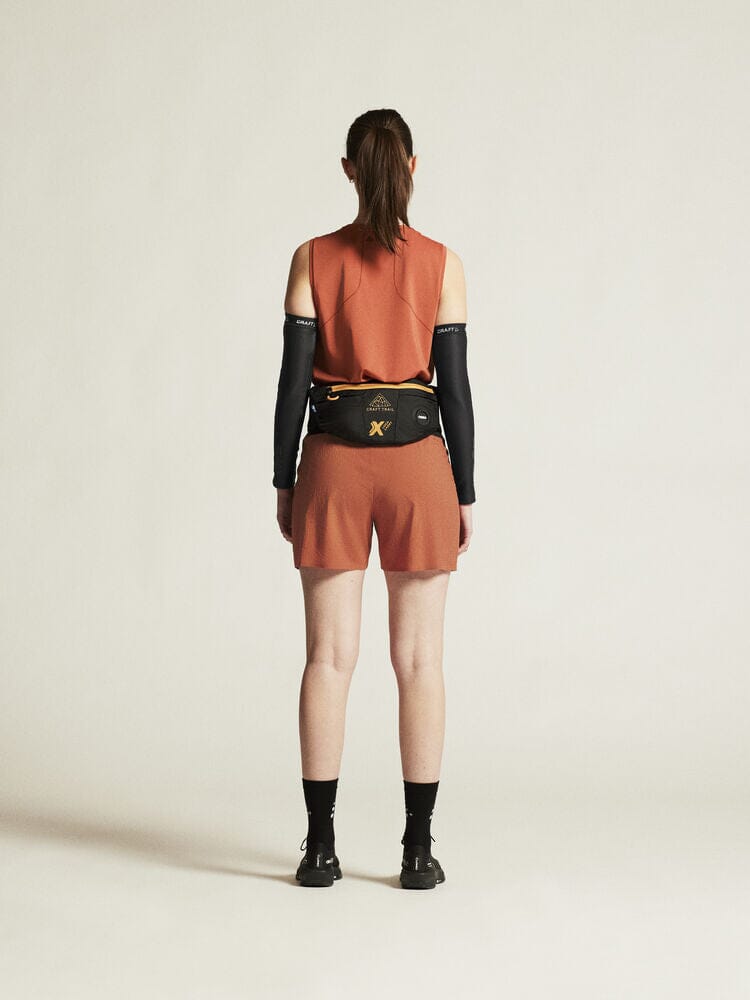 Hit the trails with comfort in the Women's PRO TRAIL Singlet 2 from Craft Sportswear. It's made from recycled polyester and elastane grid-jaquard jersey, making it an eco-friendly option for trail runners. Soft shell fabric at the neck hole eliminates the chances of chafing, while taped hems on the sleeves and bottom offer a polished finish. The t-shirt also comes with side slits for enhanced comfort, and a racer back cut for unrestricted motion. Lastly, a Craft trail logo on the front and six dots on the lower back add visual appeal.