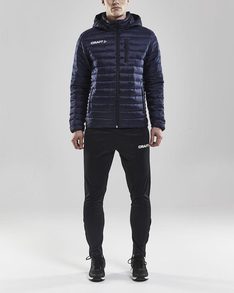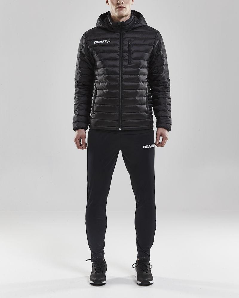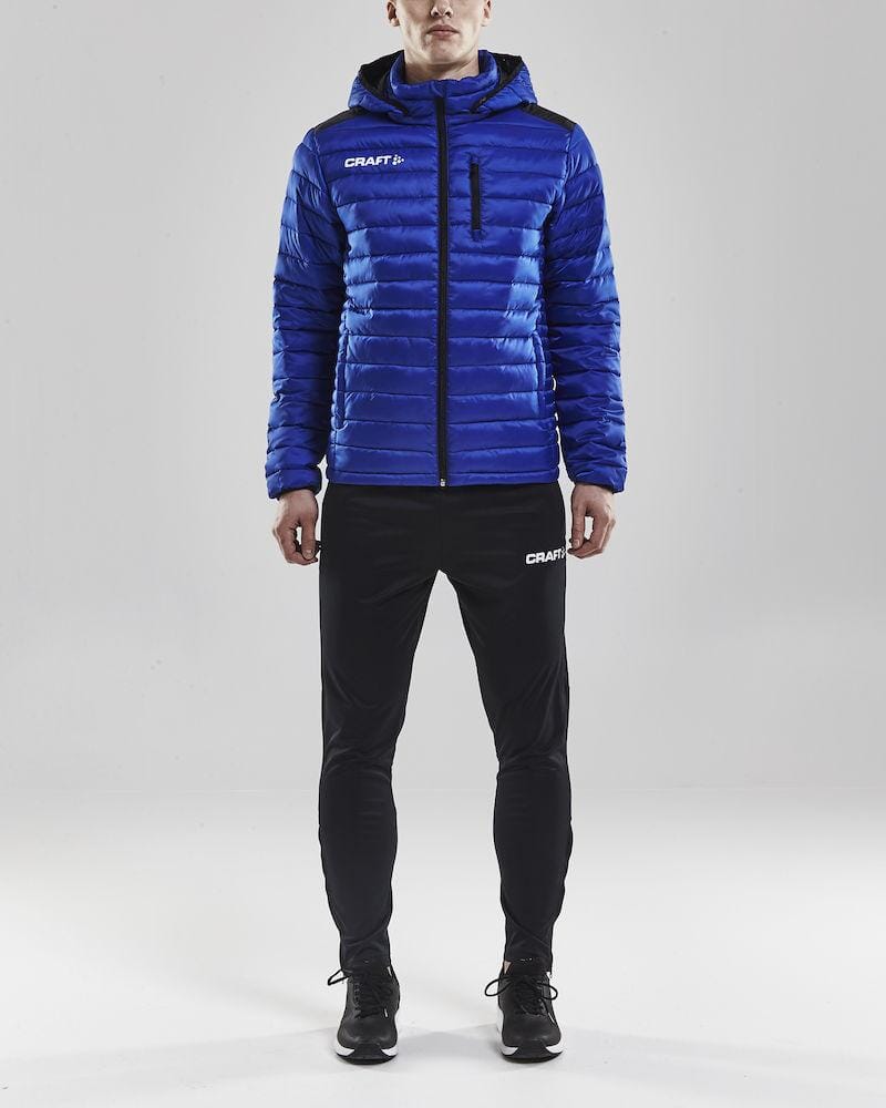 Padded, wind- and water-resistant jacket designed for warm-ups as well as more formal occasions. Features removable hood, zippered chest pocket and adjustable bottom hem. Padding made of microfiber with good thermal properties.